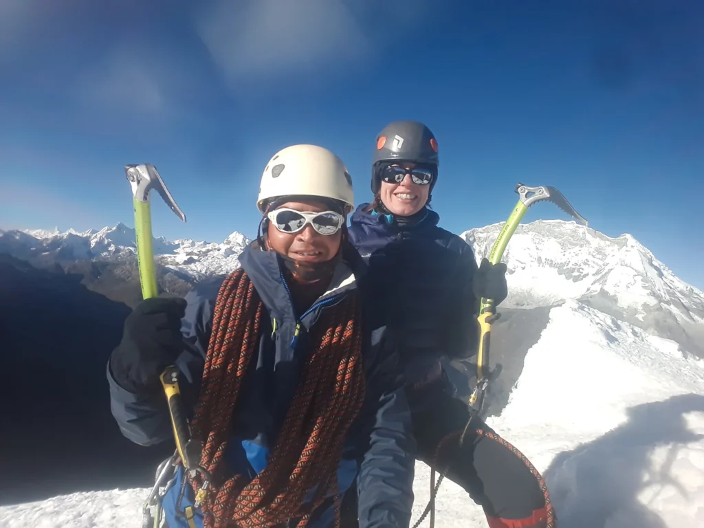 Very early in the morning, we will begin our ascent to the summit and take advantage of the good snow conditions. Temperatures range from -15°C to -20°C and the air temperature is very cold. The climb will reach a difficulty of 65°C to 70°C along the southwest ridge to the summit. After taking some photos, we will rappel down, following our previous tracks, to Camp 1 and then to the moraine camp.