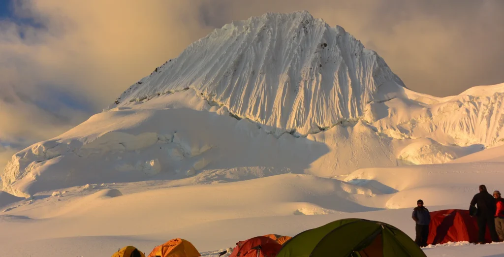 We will wake up very early to complete almost the entire ascent at night and take advantage of the best snow conditions. Temperatures range from -15°C to -20°C and the air is very cold. The difficulty level is medium, with an incline of 65° to 70°, and a wall of snow. From the summit, we will enjoy impressive views of almost the entire Cordillera Blanca. After taking some photos, we will rappel down, following our previous tracks, to Camp 1. (B, L, D)